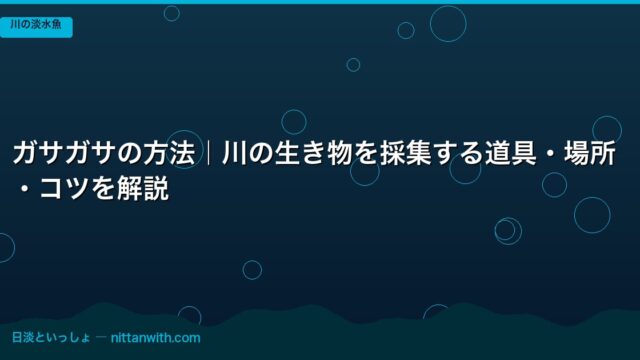 川の淡水魚 ガサガサの方法|川の生き物を採集する道具・場所・コツを解説 2026年4月4日 nittantoissyo 日淡といっしょ この記事でわかること ガサガサに必要な道具と選び方 初心者でも安心の採集場所の探し方・選び方 採れる魚が増える追い込み漁のコツ 捕まえた …