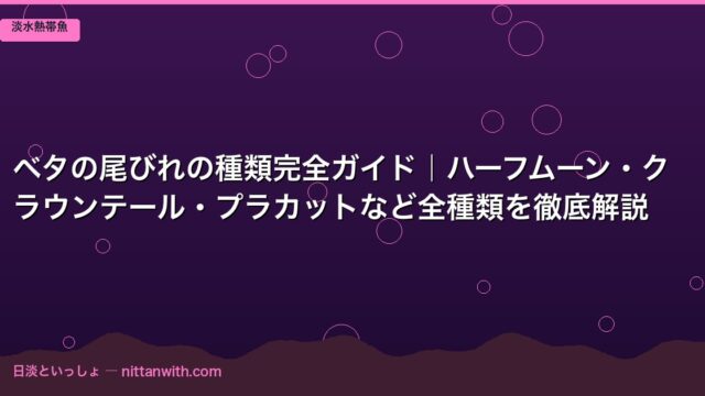 淡水熱帯魚 ベタの尾びれの種類完全ガイド|ハーフムーン・クラウンテール・プラカットなど全種類を徹底解説 2026年3月24日 nittantoissyo 日淡といっしょ ベタを初めて見たとき、その美しいヒレに思わず息を呑みました。熱帯魚ショップで初めてベタに出会った私(なつ)は、あまりにも多彩な尾びれの形に …