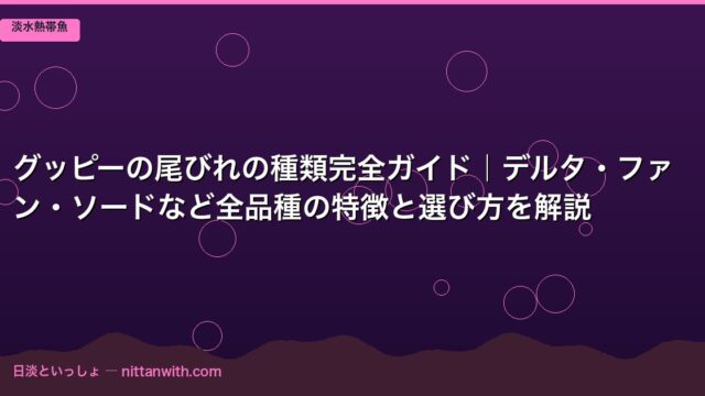 淡水熱帯魚 グッピーの尾びれの種類完全ガイド|デルタ・ファン・ソードなど全品種の特徴と選び方を解説 2026年3月24日 nittantoissyo 日淡といっしょ グッピーの尾びれの種類完全ガイド|デルタ・ファン・ソードなど全品種の特徴と選び方を解説 「グッピーってどれを選べばいいの …
