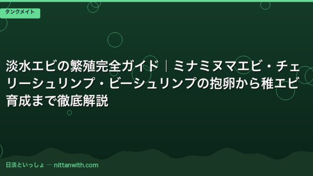 タンクメイト 淡水エビの繁殖完全ガイド|ミナミヌマエビ・チェリーシュリンプ・ビーシュリンプの増やし方を徹底解説 2026年3月24日 nittantoissyo 日淡といっしょ 水槽の前でぼーっと眺めていたある朝、ミナミヌマエビのメスのお腹に小さな緑色の粒がびっしり並んでいるのに気づいた瞬間のことを、私は今でもは …