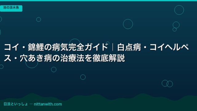 池の淡水魚 コイ・錦鯉の病気完全ガイド|白点病・コイヘルペス・穴あき病の治療法を徹底解説 2026年3月25日 nittantoissyo 日淡といっしょ ある朝、池をのぞいたら大切なコイがいつもより元気なく、体表に白い点々がびっしりついていた――。そんな経験をして、頭が真っ白になったことはあ …