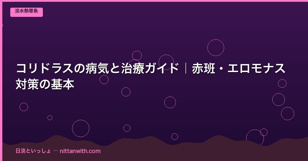 本記事では、コリドラス飼育で遭遇しやすい代表的な病気(ヒゲ溶け・エロモナス感染・白点病・カラムナリス・腸炎)の原因と治療法、そしてコリドラスならではの薬浴の注意点、底砂選びや予防の実践知まで、現場で役立つ情報をまとめました。筆者自身が60cm水槽でパンダコリドラスを3匹飼育していた時代に経験した「ヒゲ溶け」の苦い記憶と、そこから学んだ教訓も吹き出し形式で織り込んでいます。